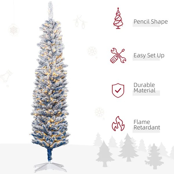 6′ Flocked Christmas Trees, Pencil Prelit Artificial Christmas Tree With Snow Branches, Blue