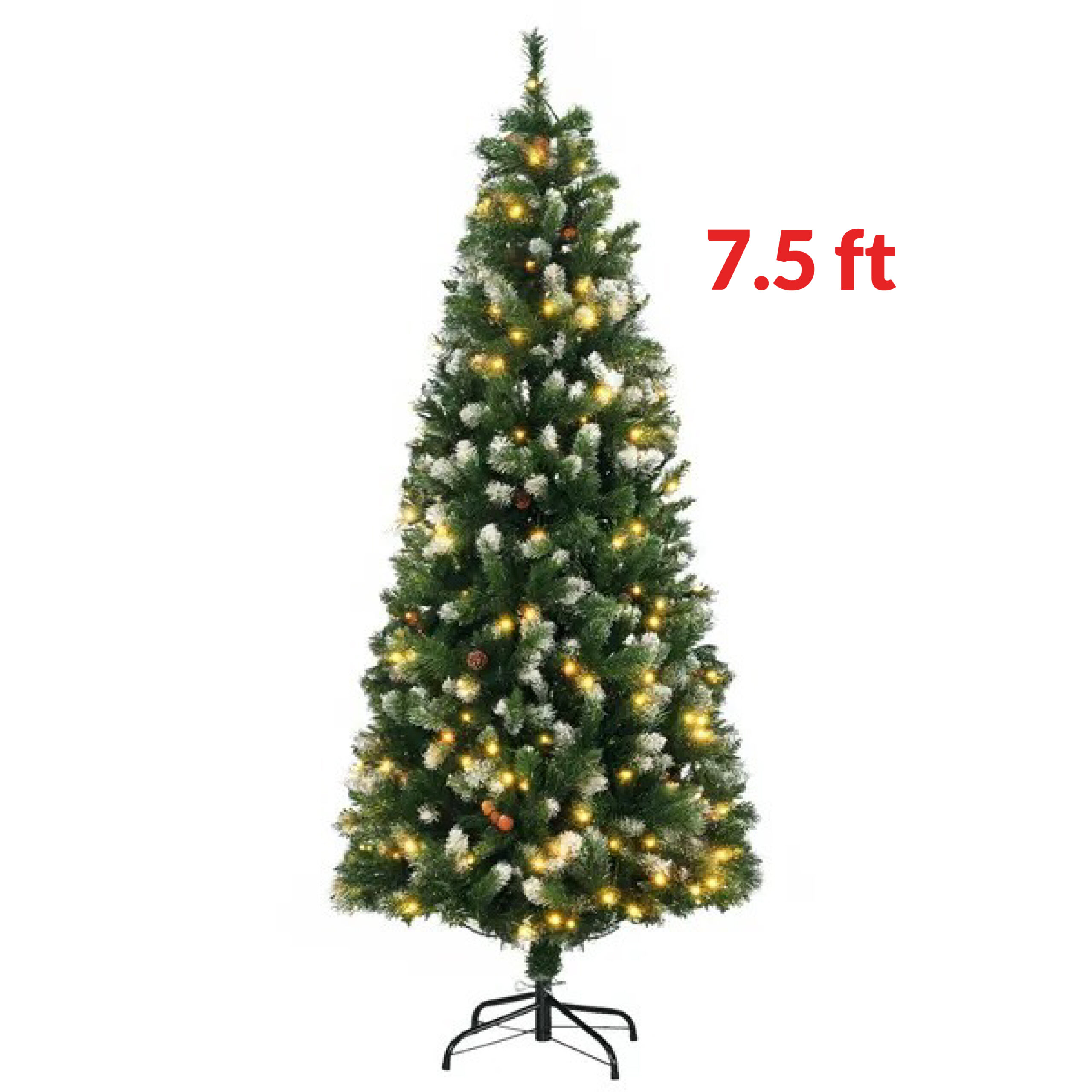 7.5′ Decorated Christmas Trees, Skinny Prelit Artificial Christmas Tree With Snow-dipped Branches, Auto Open, Pinecones